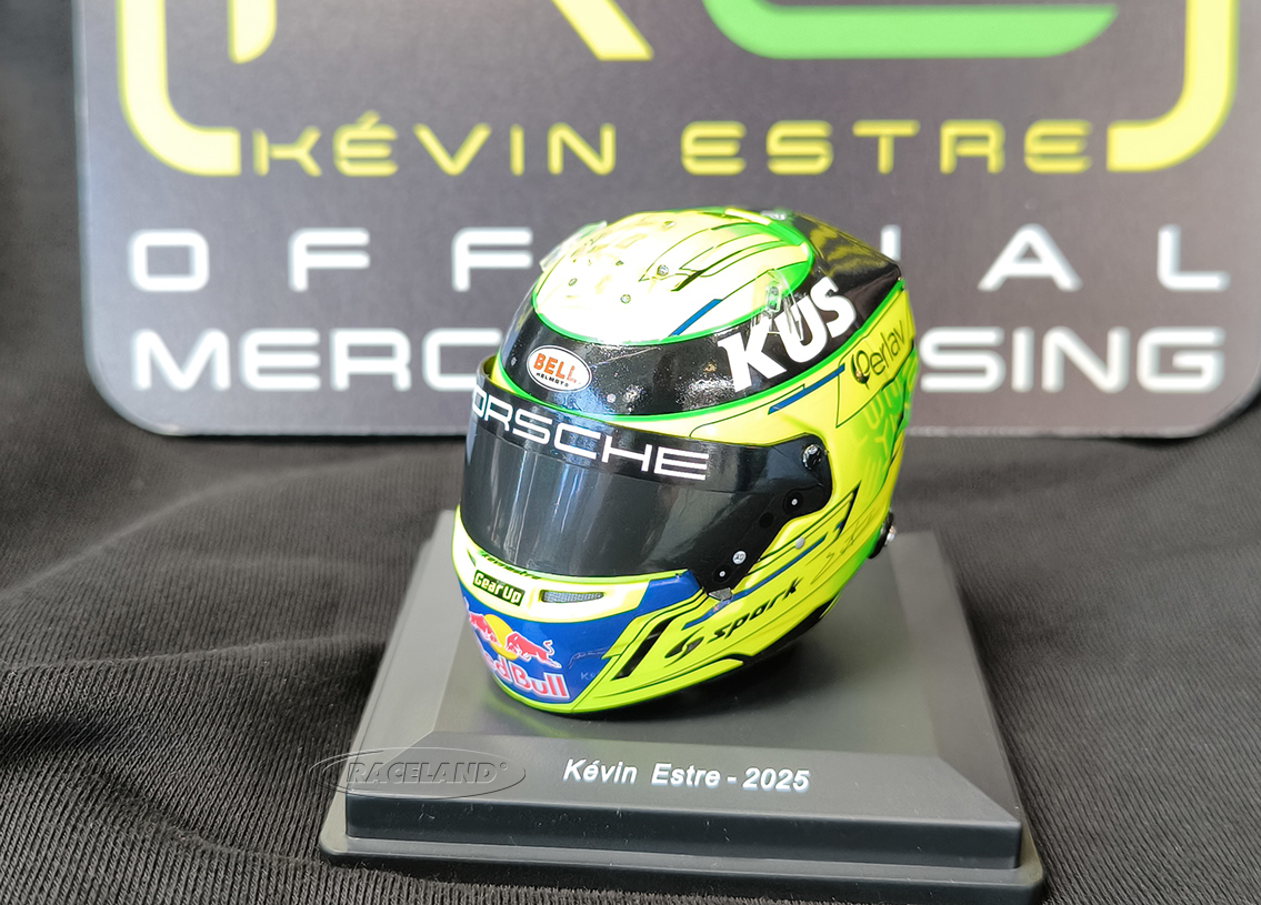 Der aktuelle Helm zu den 24-Stunden Nürburgring Nordschleife mit dem Rennstrecken-Layout auf der Rückseite. Als Erster im Ziel wurde Kevin Estre nach einer Zeitstrafe letztlich Zweiter beim Langstrecken-Klassiker in der Eifel.